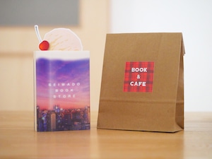 クリームソーダ(マジックアワー)のブックカバーと栞、ひとくちょうかん(くり)1個、ドリップパック(2個)、コーヒーのおともにぴったりな文庫本1冊のセット。