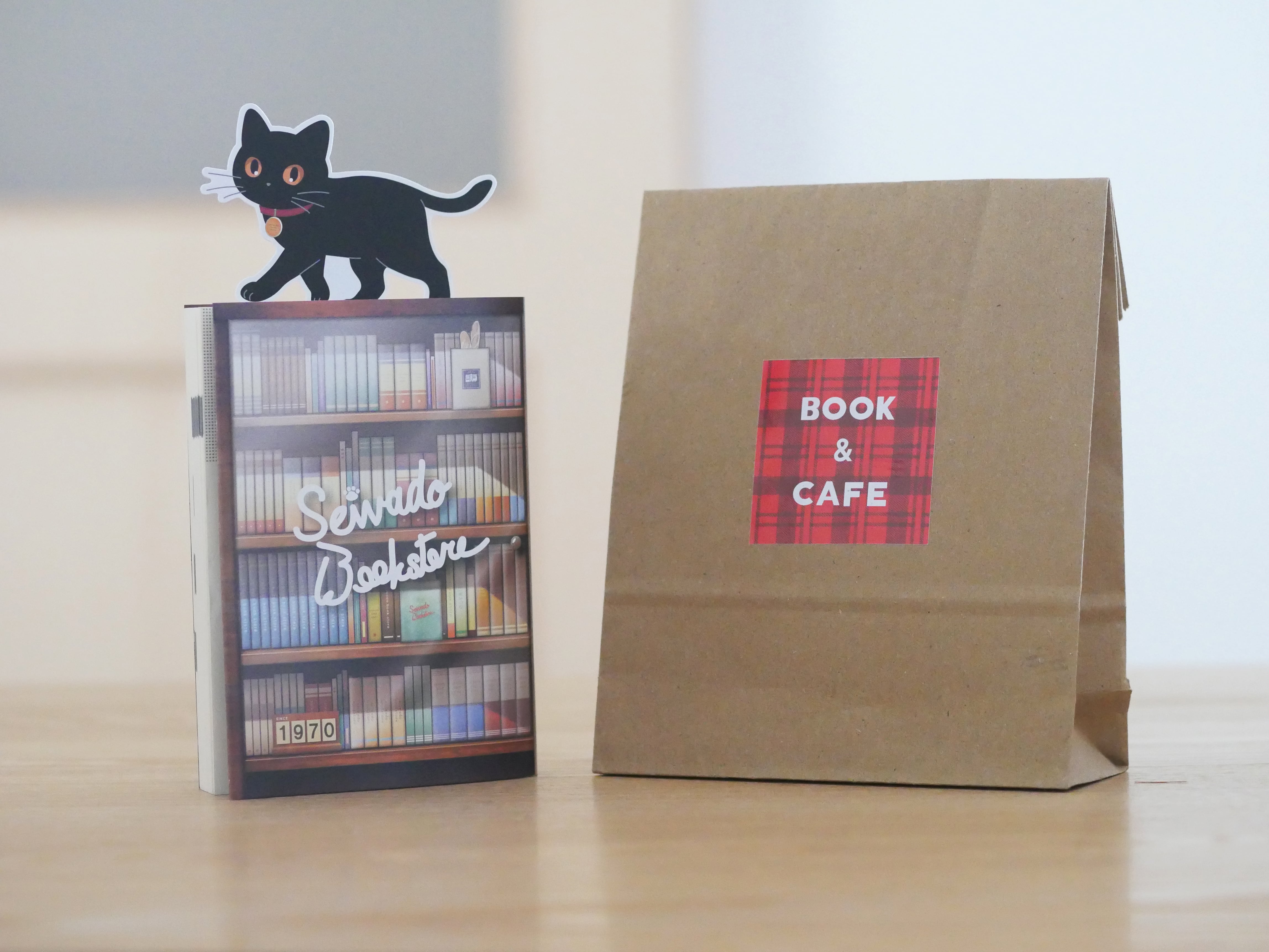 【商品】猫と本棚のブックカバーと栞(黒猫)、ドリップパック(2個)、コーヒーのおともにぴったりな文庫本1冊のセット。